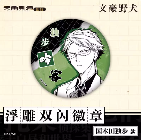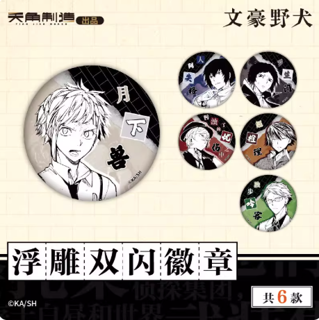 Add brilliance to your Bungo Stray Dogs collection with the Kadokawa Official Embossed Dual Glitter Badge Series. This beautifully crafted pin features Dazai Osamu and Nakahara Chuuya, showcasing intricate embossed detailing and a stunning dual-glitter finish. Perfect for decorating bags, clothing, or displaying in your anime collection.